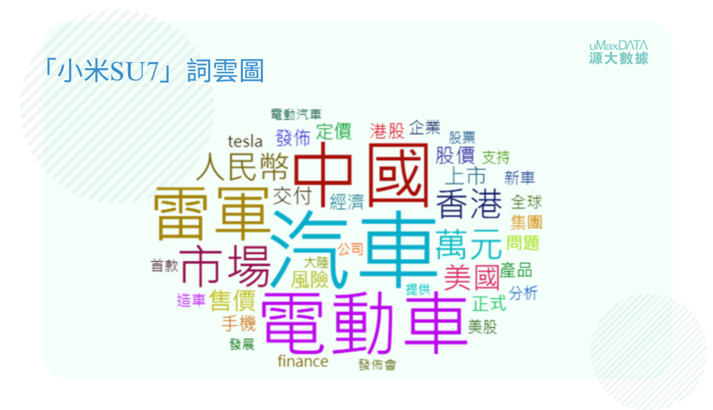 從香港源大數據運用社交智能平台 xMiner製作的詞雲圖可見,「售價」、 「定價」、「風險」説明網民關注 「小米SU7」 售價及存在的風險。另外,從「Tesla」一詞可見網民將 「小米SU7」與「Tesla」進行比較。由本年3月28日發佈至4月9日與「小米SU7」相關的文章總聲量逾6,000。