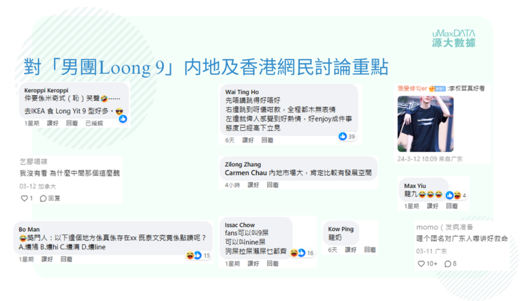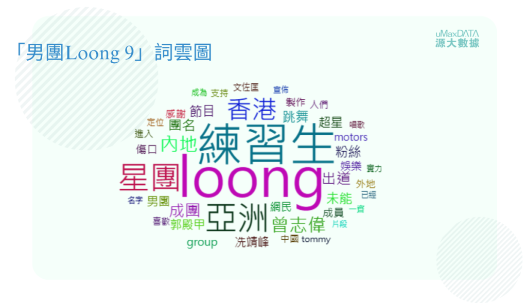 從香港源大數據運用社交智能平台 xMiner製作的詞雲圖可見,成員“郭殿甲”以及“冼靖峰”獲得較多網民的關注。另外, “内地”、 “定位”等詞語説明網民關注組合於内地市場的發展空間以及討論内地網民對此組合的爭議,組合”Loong 9”由3月9日出道至3月19日,總聲量逾47,000。