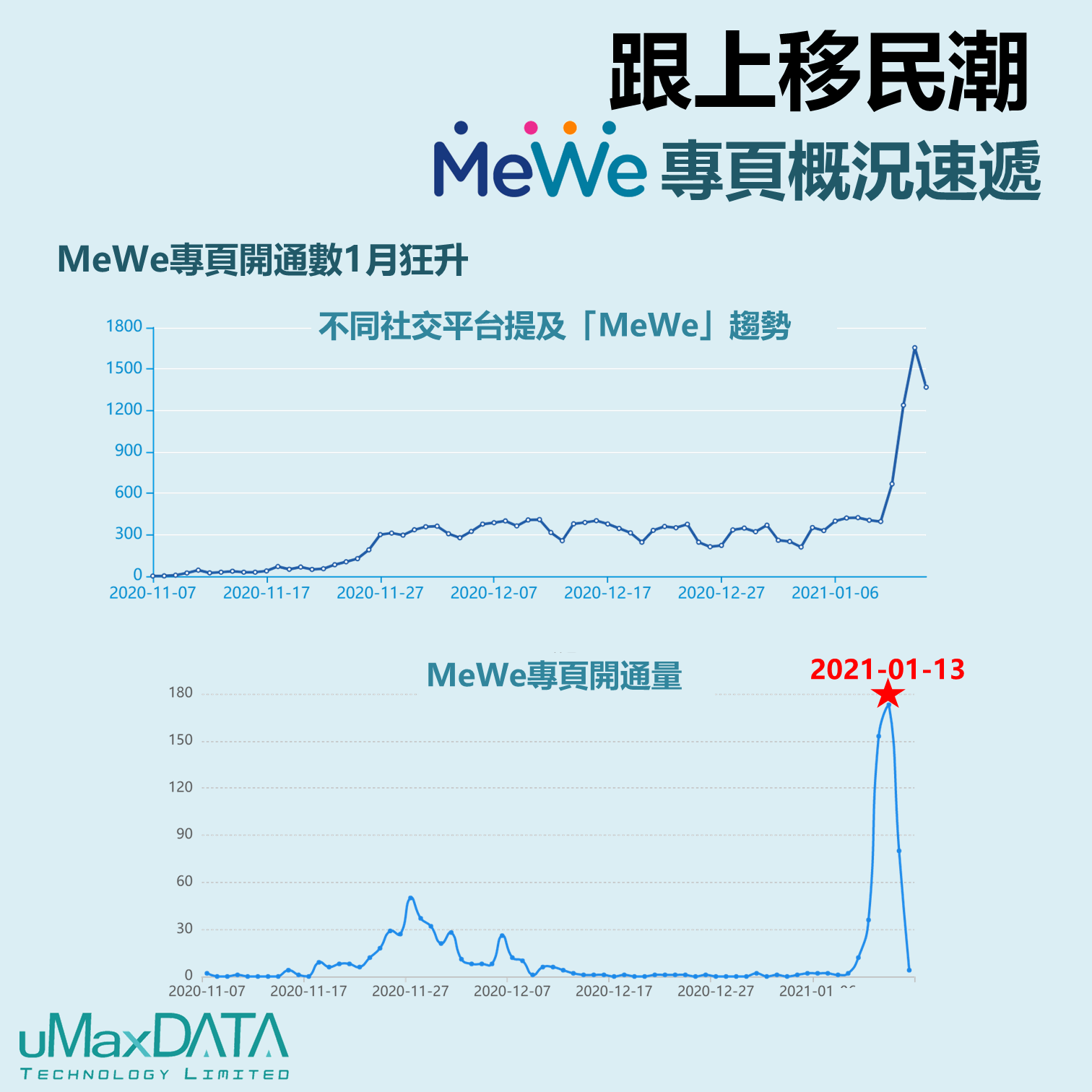 從圖中可見,社交平台由11月末開始對MeWe的討論增加,當時不少網民對舊有社交平台的審查、廣告及私隱政策感不滿,於是強調沒有廣告、不會記錄用家所看內容、不會洩露用家資料的MeWe就成為焦點,討論的聲量平穩延續至1月初。