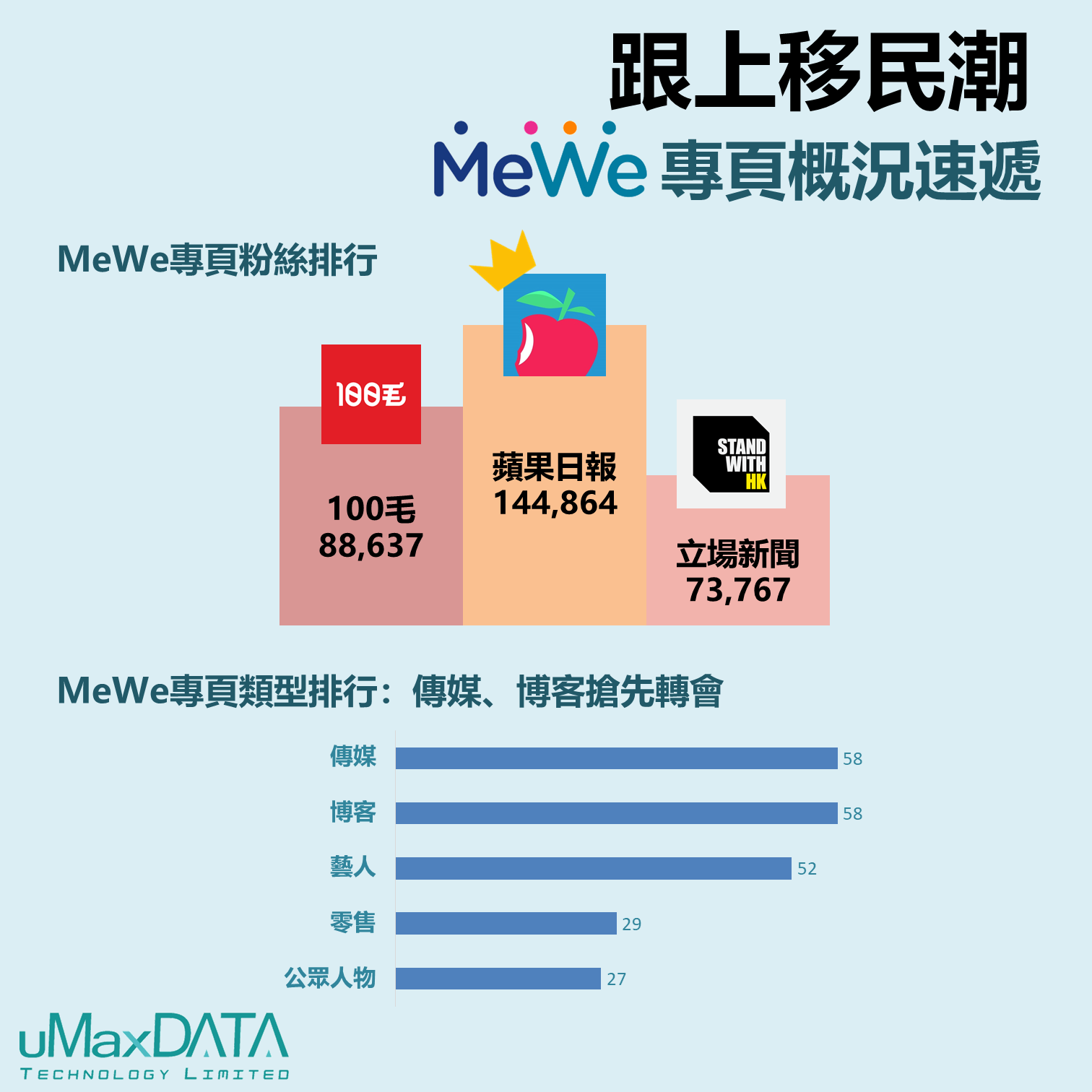 截至2021年1月15日下午4時為止,香港MeWe專頁的粉絲數頭三名均為傳媒,當中蘋果日報的粉絲數最多,共有逾14萬人粉絲,遠遠拋離次名的100毛。