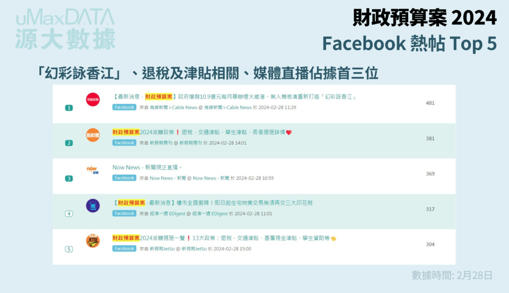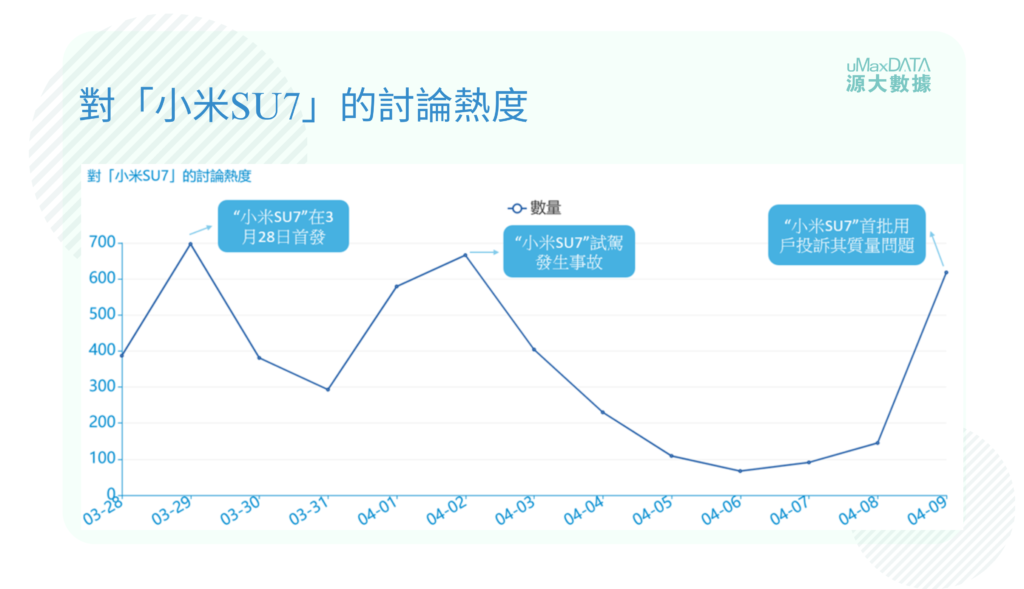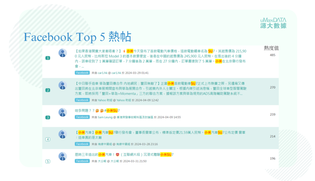 熱帖一、熱帖二、熱帖四及熱帖五通過介紹「小米SU7」以及試駕體驗的方式錄得最高的熱度值;熱帖三則轉發有關「小米SU7」首批用戶出現事故事件。