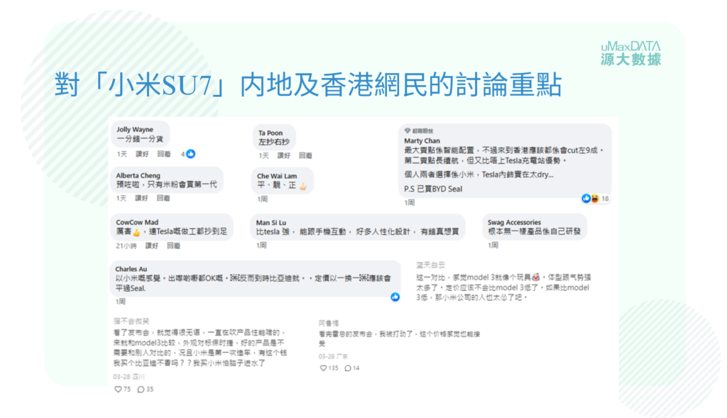討論外形與性能:有意見認為「小米SU7」的電池容量已經領先其他電車品牌;亦有意見認為「小米SU7」最大賣點是智能配置,但港版可能會被減少9成相關功能;另有意見認為小米在港缺乏充電站優勢。還有意見質疑「小米SU7」性能配置等方面大部分都是抄襲其他電車品牌,并沒有什麽功能或配置是自主研發;另外,有網民將「小米SU7」與「Tesla」的外觀對比,認為兩者外觀相似;但在内飾方面,「小米SU7」較「Tesla」更為吸引。