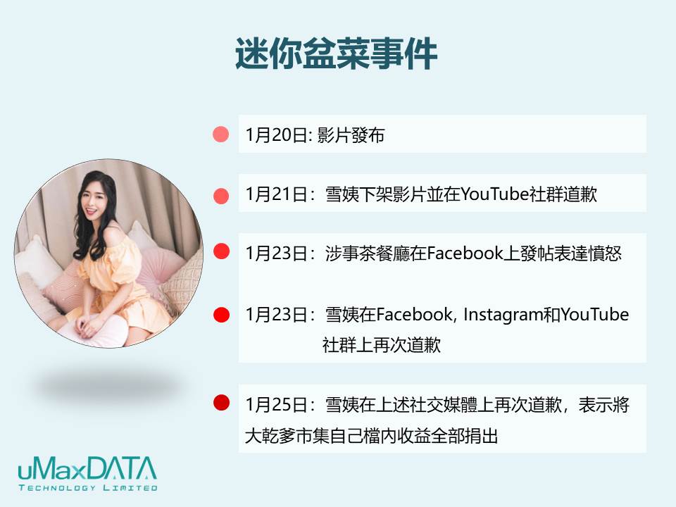 香港知名YouTuber Snow E雪姨(容可兒)向來言行出位,深受網民歡迎,可她於1月20日發布的迷你盆菜比較影片,卻引來一場公關災難。影片中雪姨將茶餐廳的迷你盆菜與大酒店的盆菜作比較,在批評茶餐廳的迷你盆菜時借機賣生髮水的廣告。影片一發布即引起網民批評攻擊,指責內容不實且令人反感。然而,雪姨的公關回應和自稱是其員工在社交媒體上的反擊卻又再引起網民不滿,終釀成公關災難。
