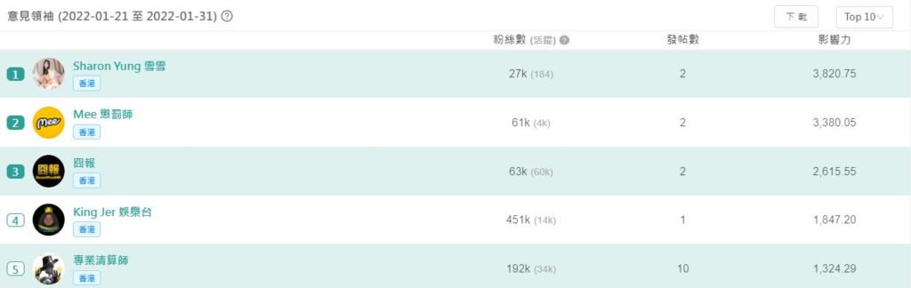 以雪姨事件為例,在最多討論熱度的網上渠道Facebook中,頭五名最有影響力的意見領袖分別是她的賬號、Mee 懲罰師、囧報、King Jer 娛樂台和專業清算師。
