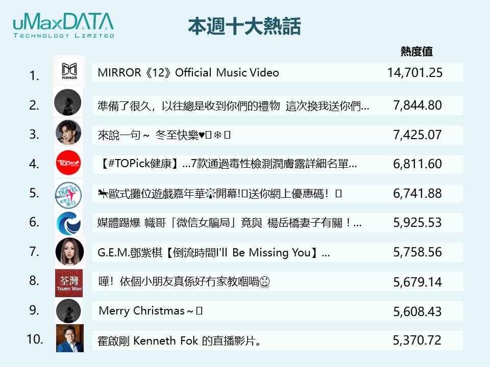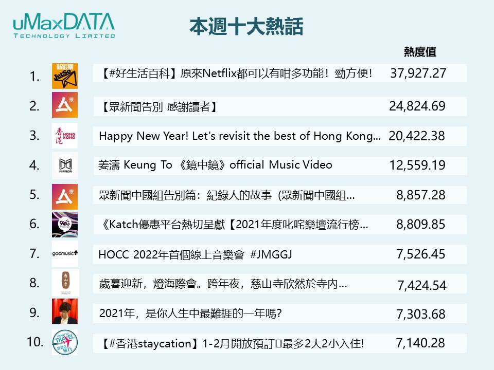 源大數據從各大社交媒體中,找出2021年12月31日至2022年1月6日期間,在網絡上討論度最高的話題,並歸納為十大熱話排行榜。