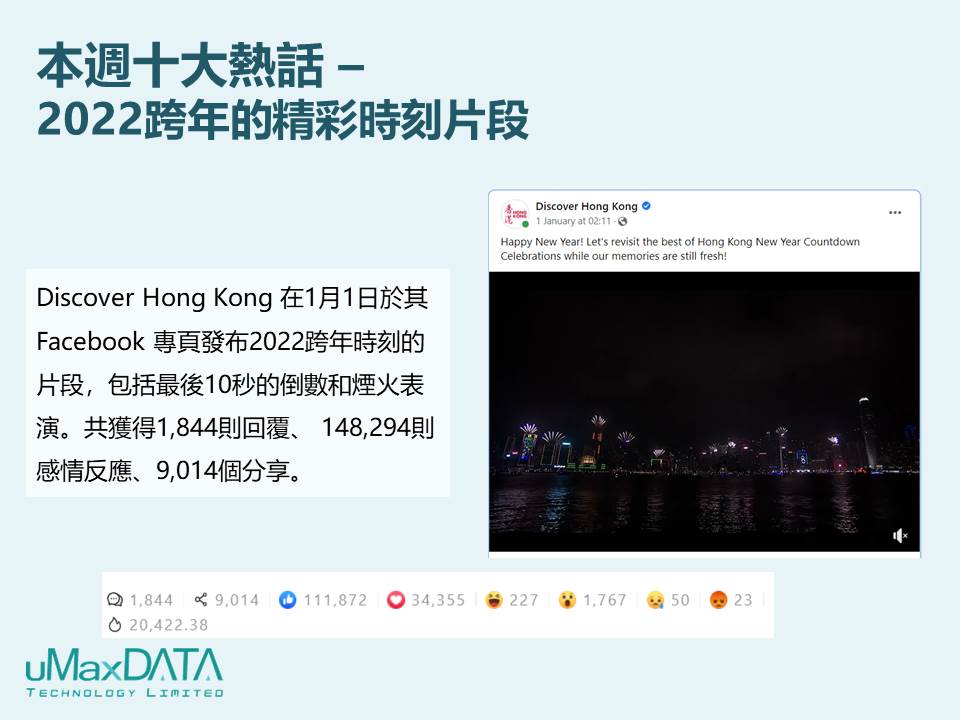 Discover Hong Kong 在1月1日於其Facebook 專頁發布2022跨年時刻的片段,包括最後10秒的倒數和煙火表演。共獲得1,844則回覆、 148,294則感情反應、9,014個分享。