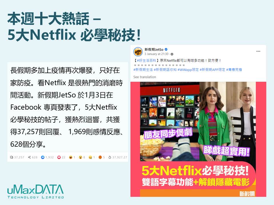 長假期多加上疫情再次爆發,只好在家防疫。看Netflix 是很熱門的消磨時間活動。新假期JetSo 於1月3日在Facebook 專頁發表了,5大Netflix 必學秘技的帖子,獲熱烈迴響,共獲得37,257則回覆、 1,969則感情反應、628個分享。