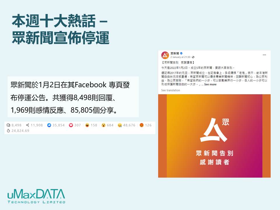 眾新聞於1月2日在其Facebook 專頁發布停運公告。共獲得8,498則回覆、 1,969則感情反應、85,805個分享。