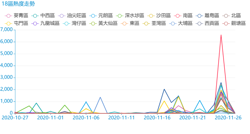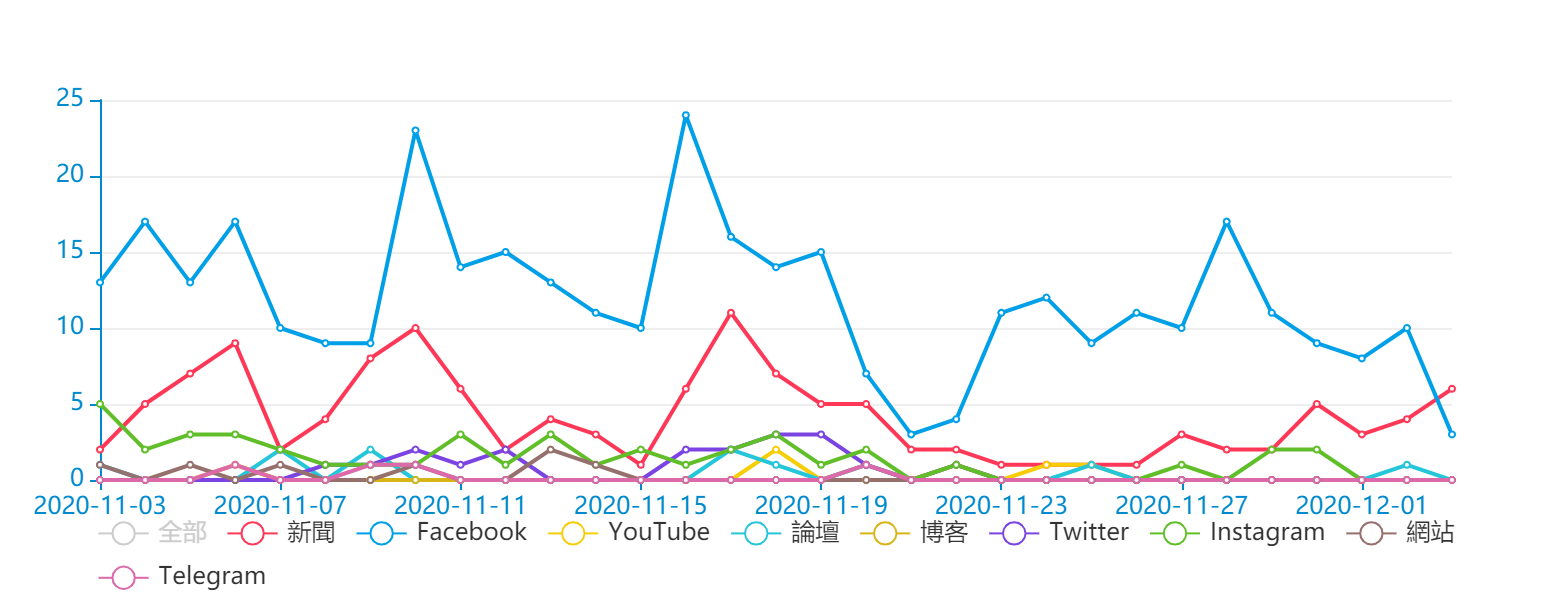 縱觀2020年Facebook上傳媒發佈疫情相關帖文的熱度值趨勢,可見討論自1月23日本港出現首宗確診個案開始,直至2月,因醫護罷工要求封關及全城搶口罩等種種事件達至高峰。其後,熱度值趨勢便持續大幅下降,即使3月第二波疫情爆發時,熱度仍大幅落後於2月,及後一直跌至7月,即疫情至今最嚴重的第三波爆發才稍稍回升,惟整體熱度值仍及不上年初,之後熱度值再一直下降至年尾。