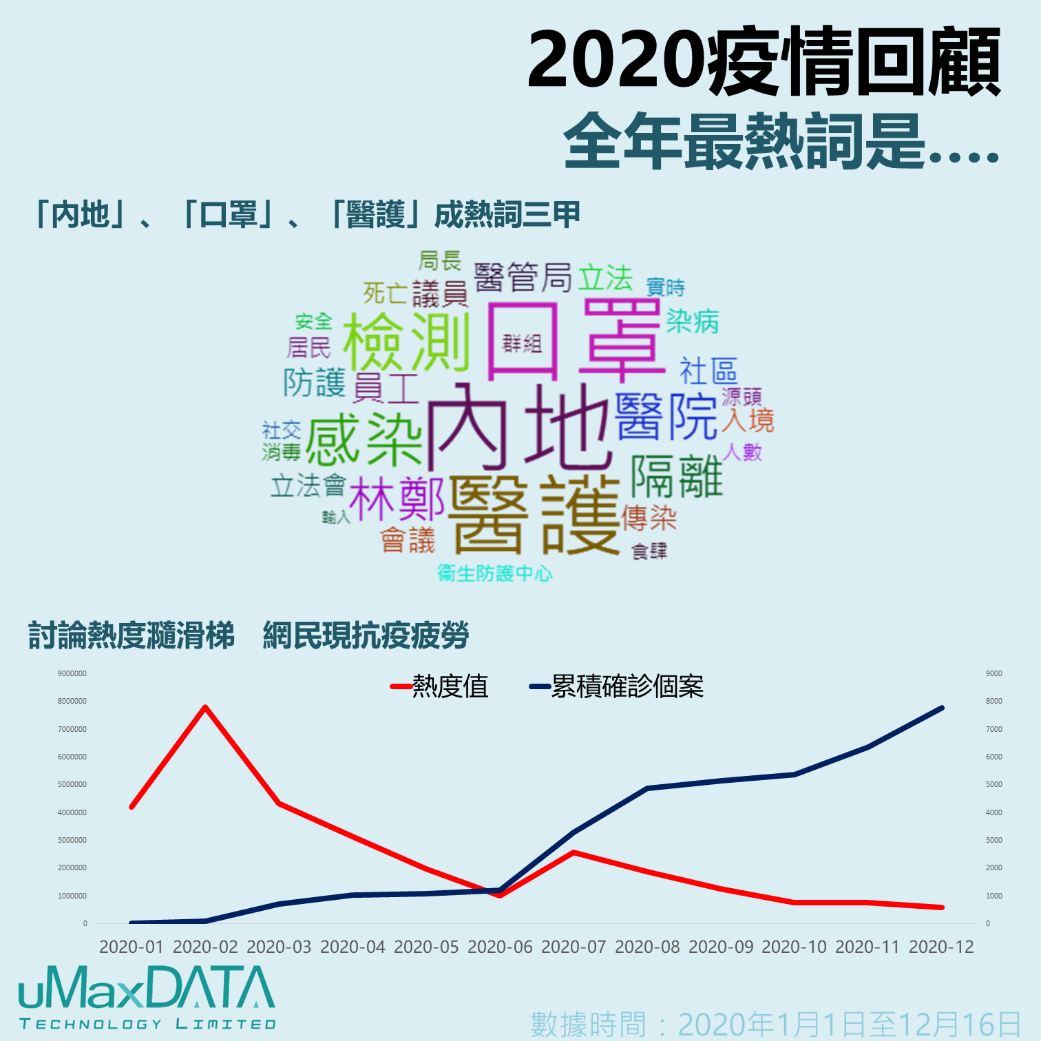 網民從年初一直關心內地的疫情狀況,一開始擔心病毒會由內地傳播到港,中期內地派員支援香港進行全民檢測計劃也一度引起討論,直到年尾,社會仍然對向內地通關以及內地研發的疫苗十分關注,令「內地」貫穿全年,成為最熱門關鍵字。