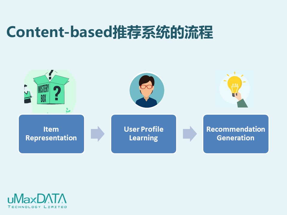 基於內容推薦(content-based recommender systems,簡稱CB)是最早也是最主流的推薦方法,到今天為止仍然有大量的工業推薦系統算法中融合了內容推薦算法。Content-based推薦系統根據用戶過去喜歡的物品,為用戶推薦和他過去喜歡的產品相似的產品。